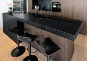 Kuchnia często jest łączona z salonem. To daje poczucie jeszcze większej przestrzeni. W naszej realizacji dominowało drewno w połączeniu z czernią. Zastosowaliśmy blat kuchenny inspirowany czarnym granitem w formie wyspy kuchennej, zapewniając dodatkową przestrzeń do gotowania.