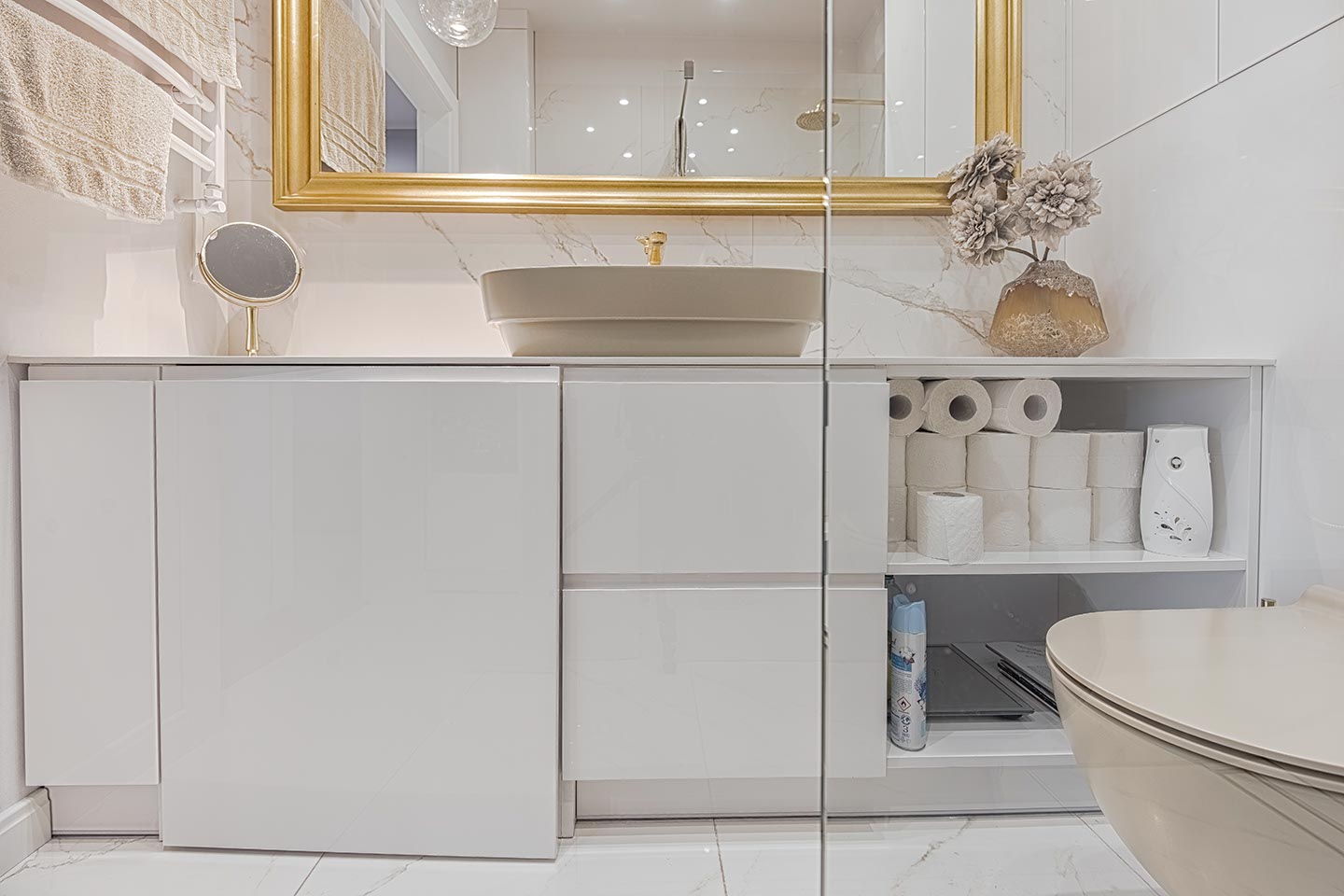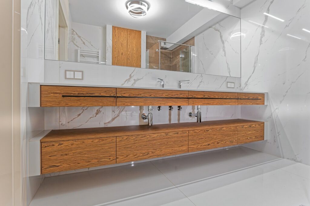 Każde szafki łazienkowe powinny być praktyczne, tak aby zachować porządek w całym pomieszczeniu. Kosmetyki czy środki czystości powinny być schowane – dzięki temu będziesz mieć więcej przestrzeni do zagospodarowania.
