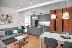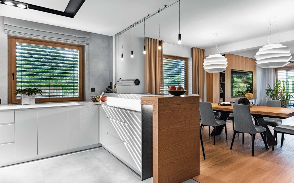 Natomiast jeżeli chcemy, aby kuchnia wyróżniała się od salonu, a któreś z tych pomieszczeń było mocniej zaakcentowane, wtedy warto oddzielić strefę gotowania od strefy odpoczynku.